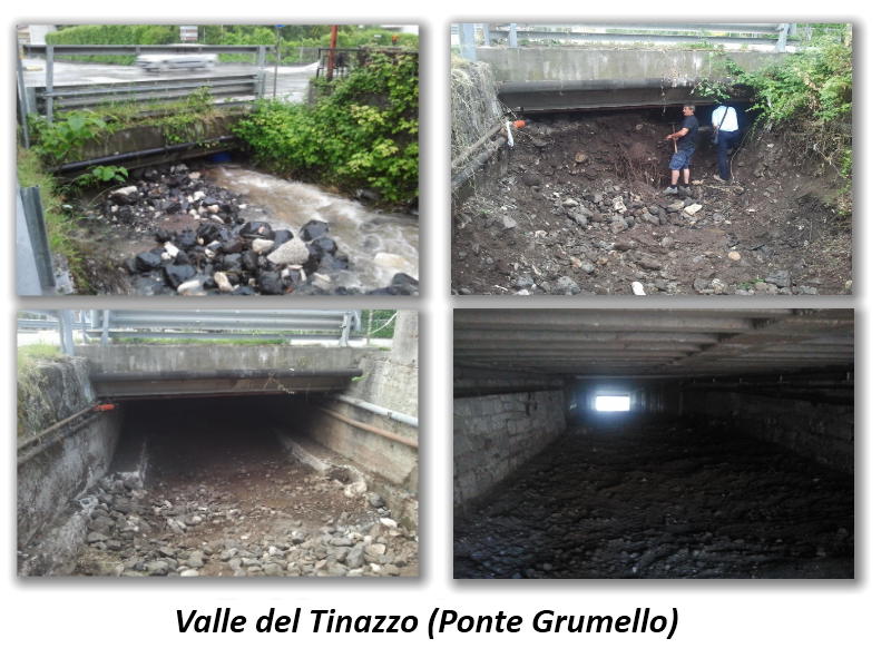 grumelloPrima dell'intervento si può osservare come la parte libera da materiale di deposito (terra e sassi) fosse pressoché nulla ed insufficiente con il rischio che l’acqua non trovando sbocchi adeguati potesse riversarsi completamente in strada. L’intervento ha avuto come scopo quello di ridurre il rischio di esondazioni e la messa in sicurezza dell’arteria provinciale, ripristinando il corretto alveo su cui scorrere la valle del Tinazzo.