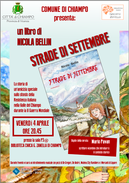 Il Comune di Chiampo e la Biblioteca civica G. Zanella sono lieti di ospitare la presentazione del libro "Strade di settembre" di Nicola Bellin presso la SALA P3 (piano terra della biblioteca) venerdì 4 aprile alle ore 20.45.