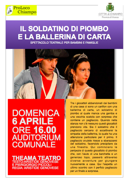 Domenica 6 aprile alle ore 16.00, presso l'auditorium comunale, Theama Teatro presenta lo spettacolo per bambini e famiglie "Il soldatino di piombo e la ballerina di carta".