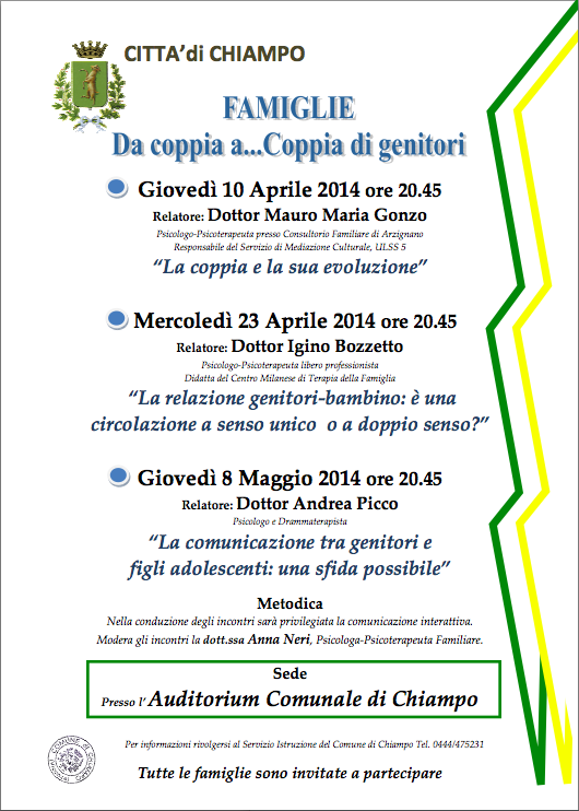 L'amministrazione di Chiampo, in collaborazione con le associazioni e gli enti della città che operano con le famiglie sul territorio e la dott.ssa Anna Neri che sta svolgendo il "servizio di supporto psicopedagogico per le scuole ed il territorio" nel nostro comune, ha organizzato degli incontri per le famiglie.