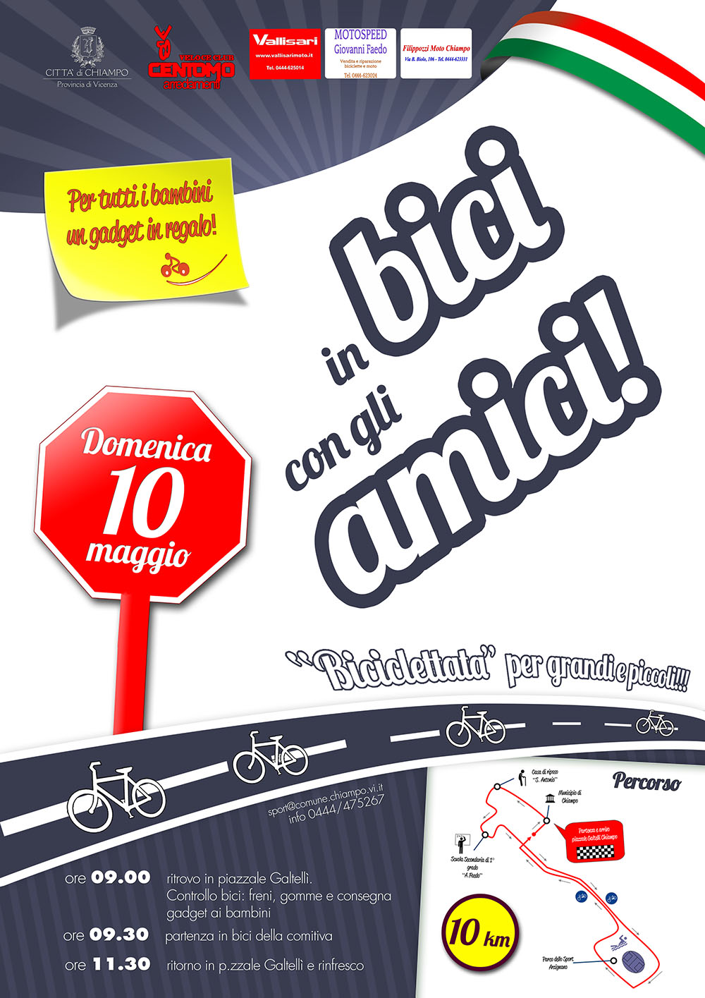 Nella mattinata di domenica 10 maggio 2015 (in caso di maltempo posticipata al 17/05/2015), avrà luogo a Chiampo una “biciclettata” in collaborazione con le associazioni sportive ciclistiche del territorio, aperta a tutti i bambini, adulti e famiglie nello spirito della socializzazione e della riscoperta della bicicletta come mezzo di trasporto eco-sostenibile.